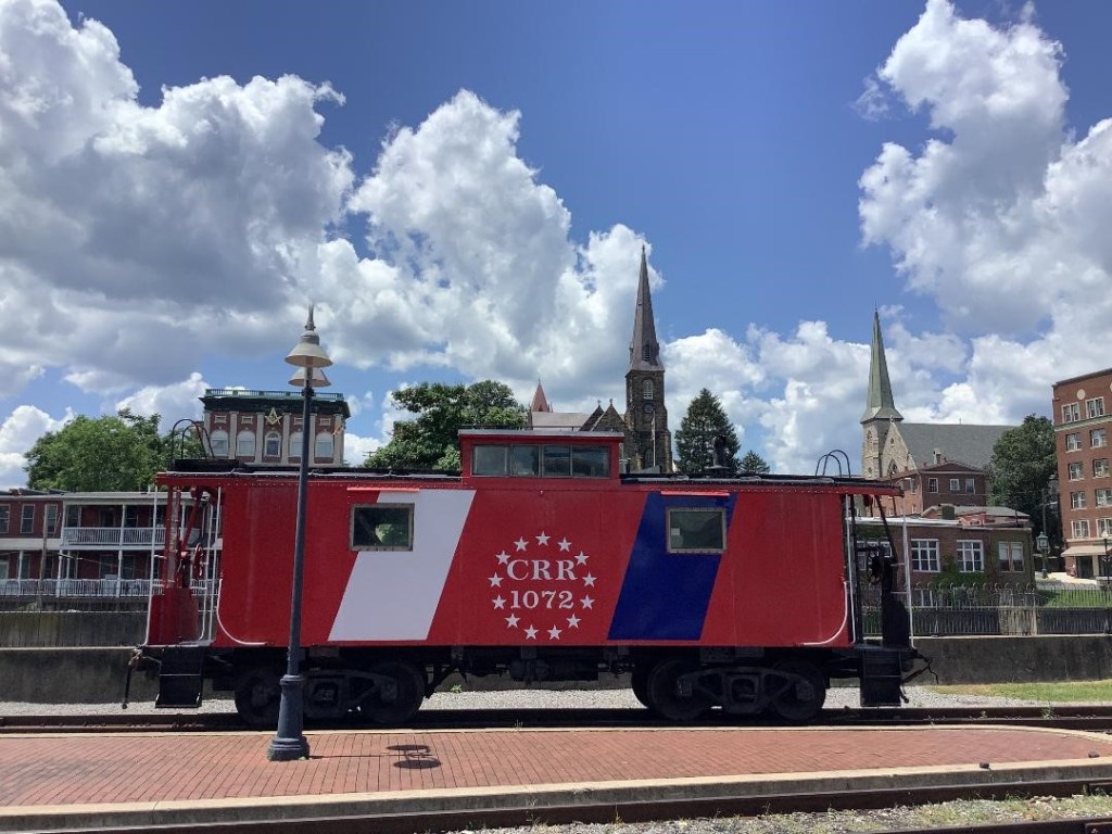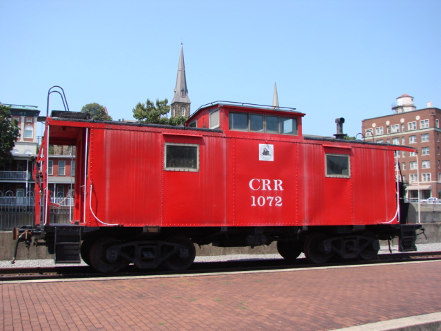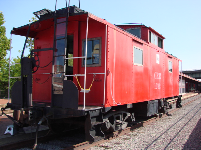 Welcome aboard the CRR 1072 caboose. This particular caboose was built in July 1948 for the Clinchfield Railroad. It is now owned by the Western Maryland Chapter of the National Rail-way Historical Society (NRHS). We re-painted the exterior back to the original bright red color with white lettering as can be seen in the framed photograph attached to the wall above the bench seat. But the interior of the caboose was left almost exactly as it was when CSX Transportation kindly donated this railcar to the Western Maryland Chapter NRHS in 1990. However in July 2023 to celebrate the 75th anniversary of this caboose, the interior was re-painted back to its original color with Sherwin-Williams Reclining Green (SW 6744). So one can see that the caboose is not a fancy railcar – it is a work place for the freight train conductor and rear brakeman. The ca-boose has just a few basic conveniences for the crew, such as the table with two bench seats around it, the diesel-fueled stove to heat the caboose in cold weather or to cook food, and within the aluminum enclosure at the far end of the caboose is the latrine.